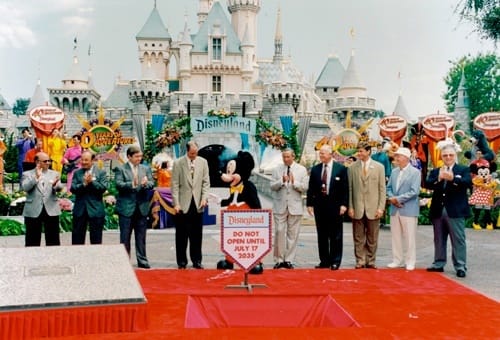 Walt with his partner Mickey Mouse and other characters in front of the Sleeping Beauty Castle during Disneyland’s 10th Anniversary.